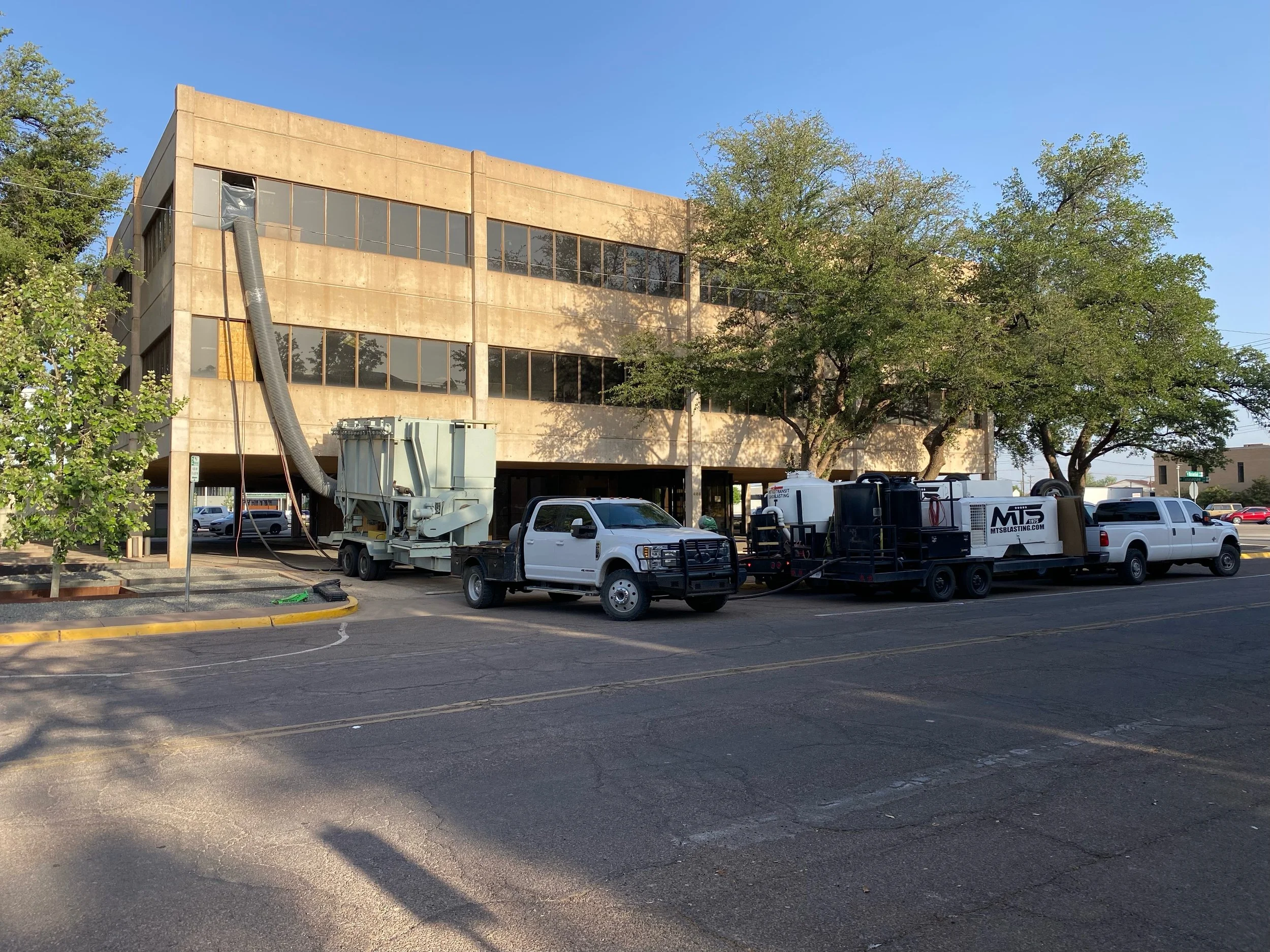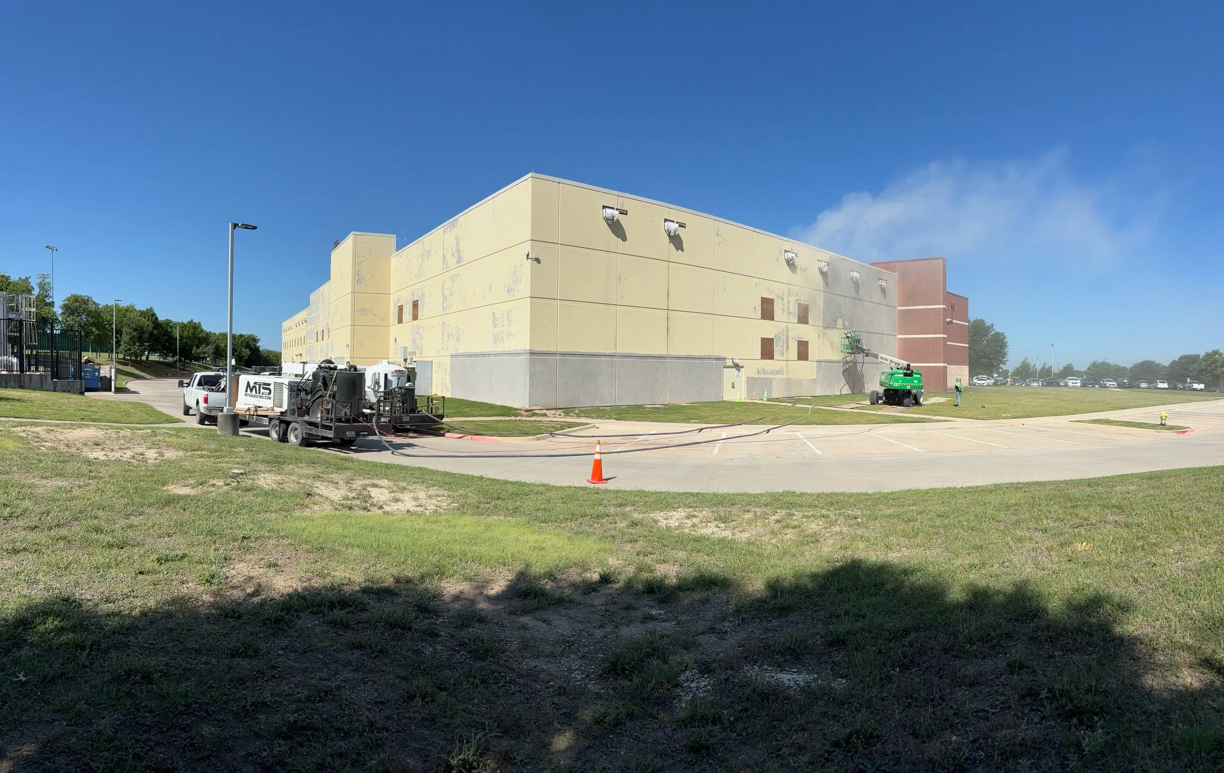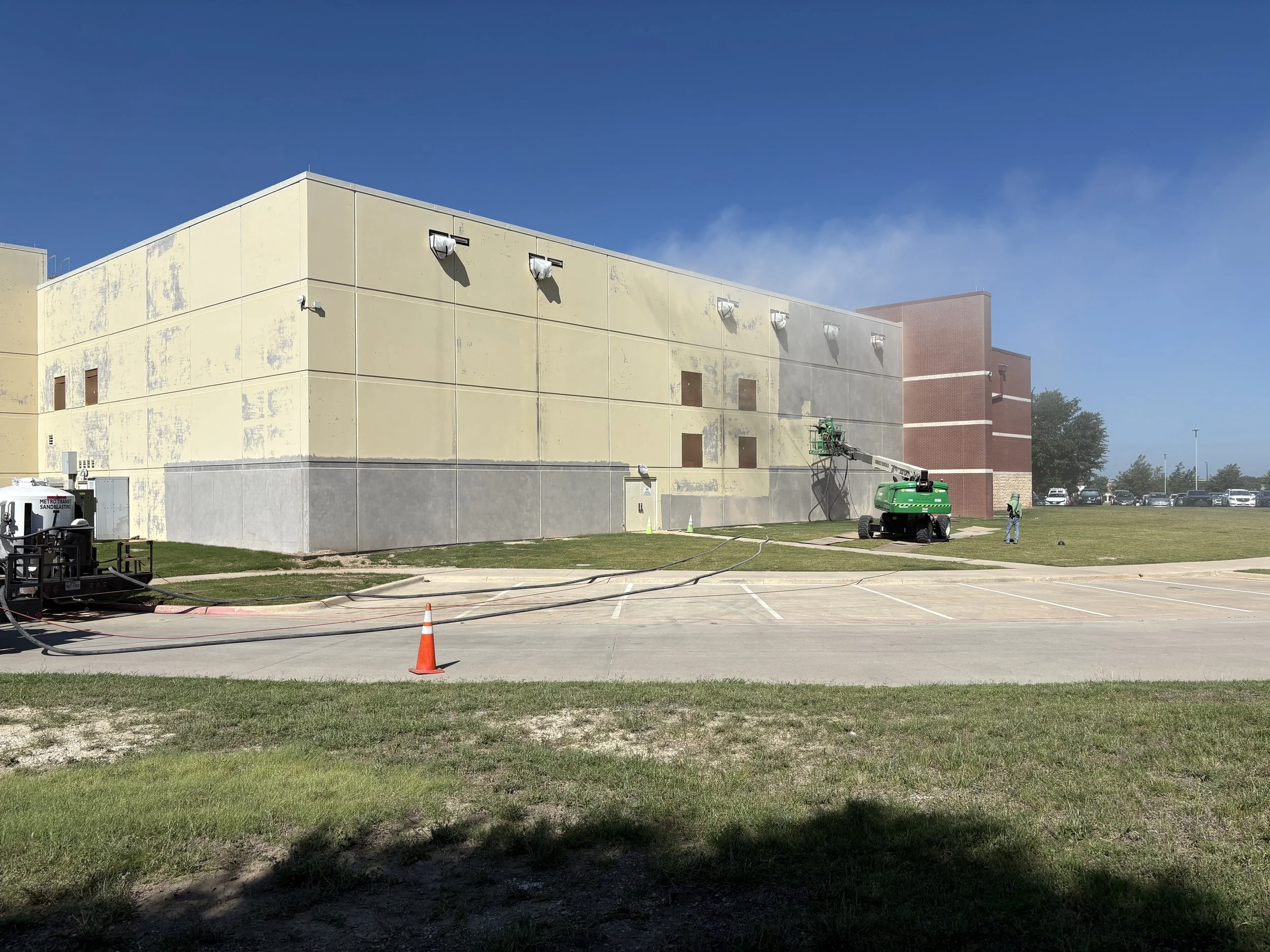 MTS sandblasted to remove failed paint on concrete tiltwall panels.