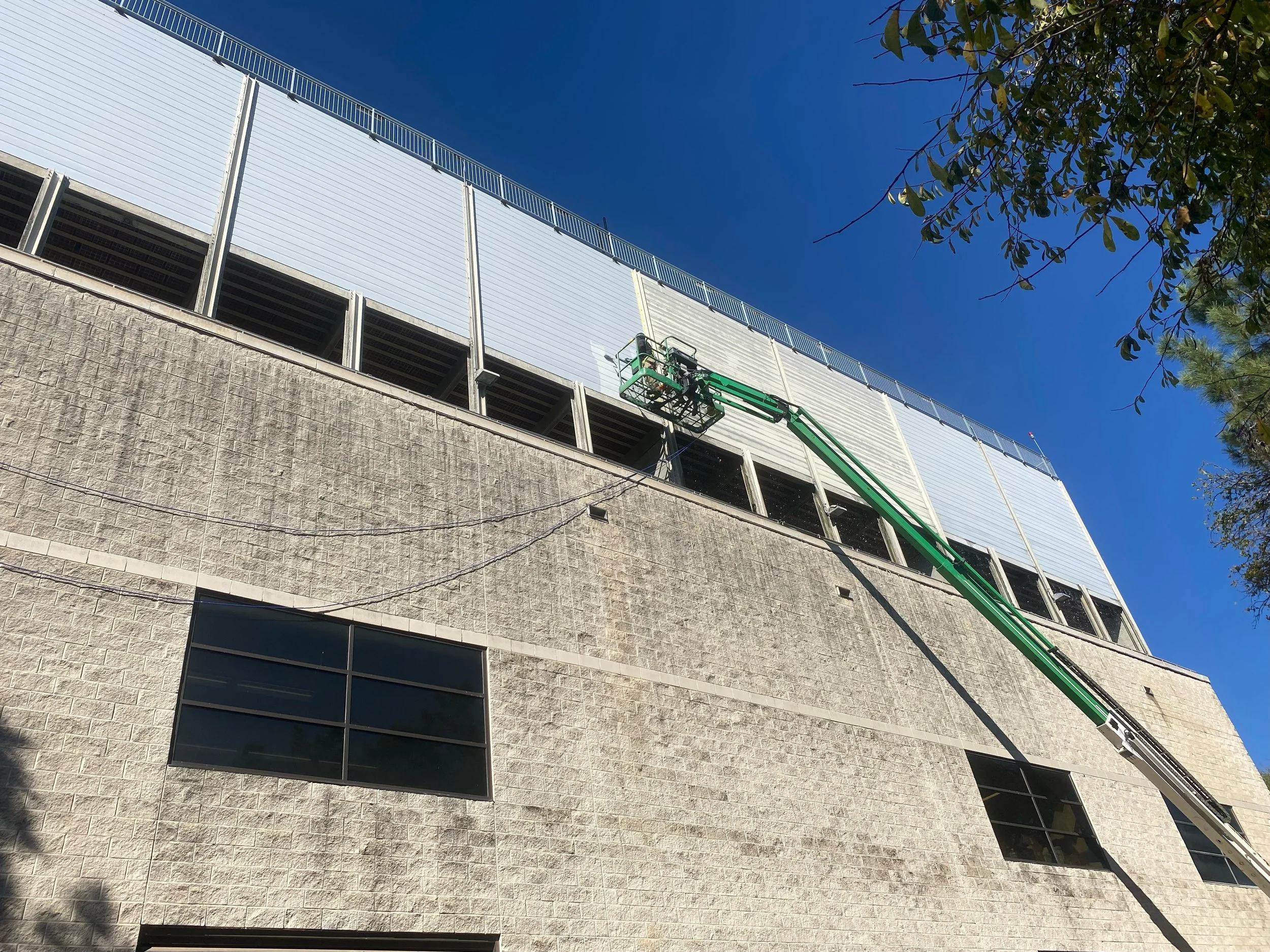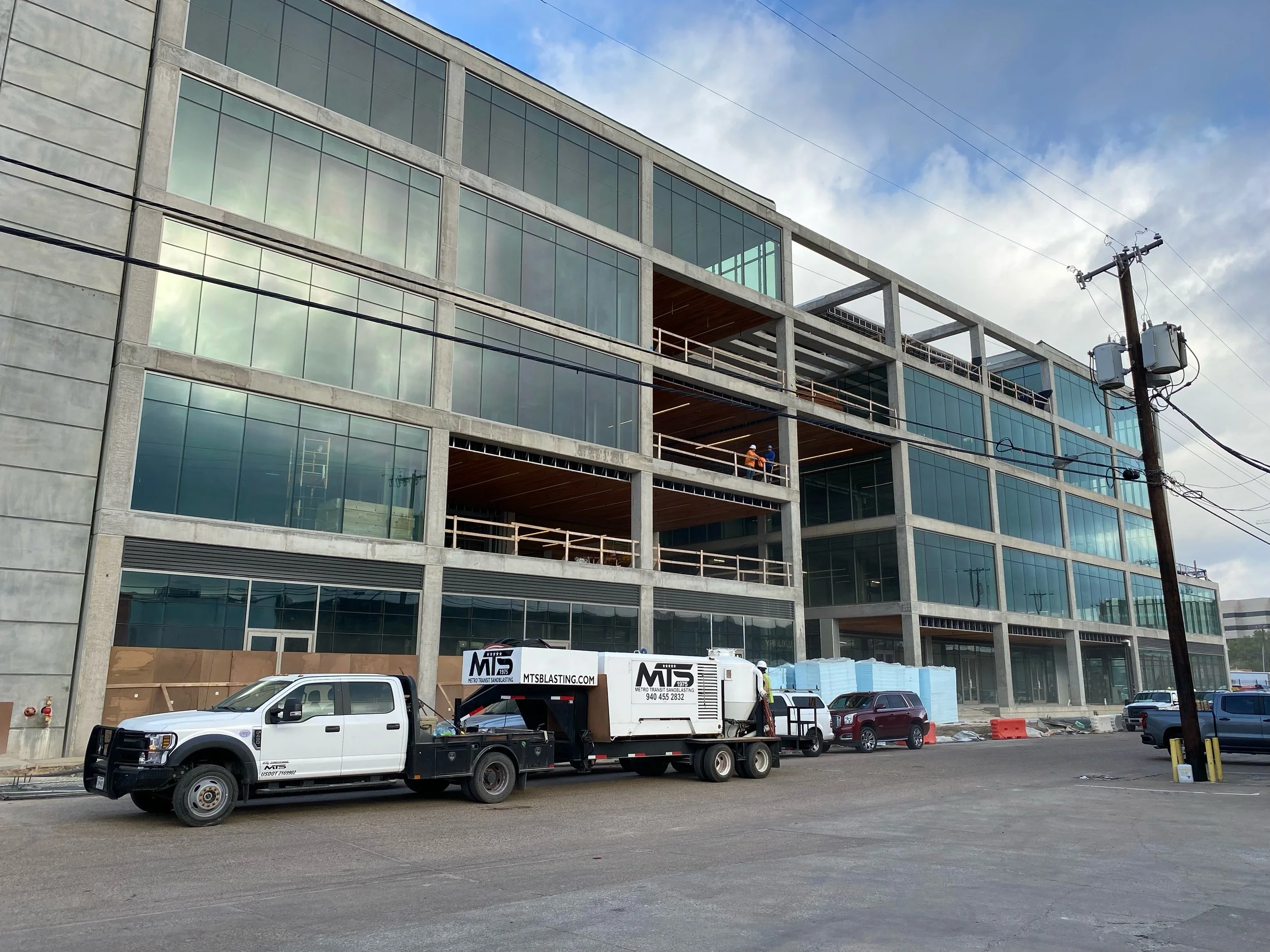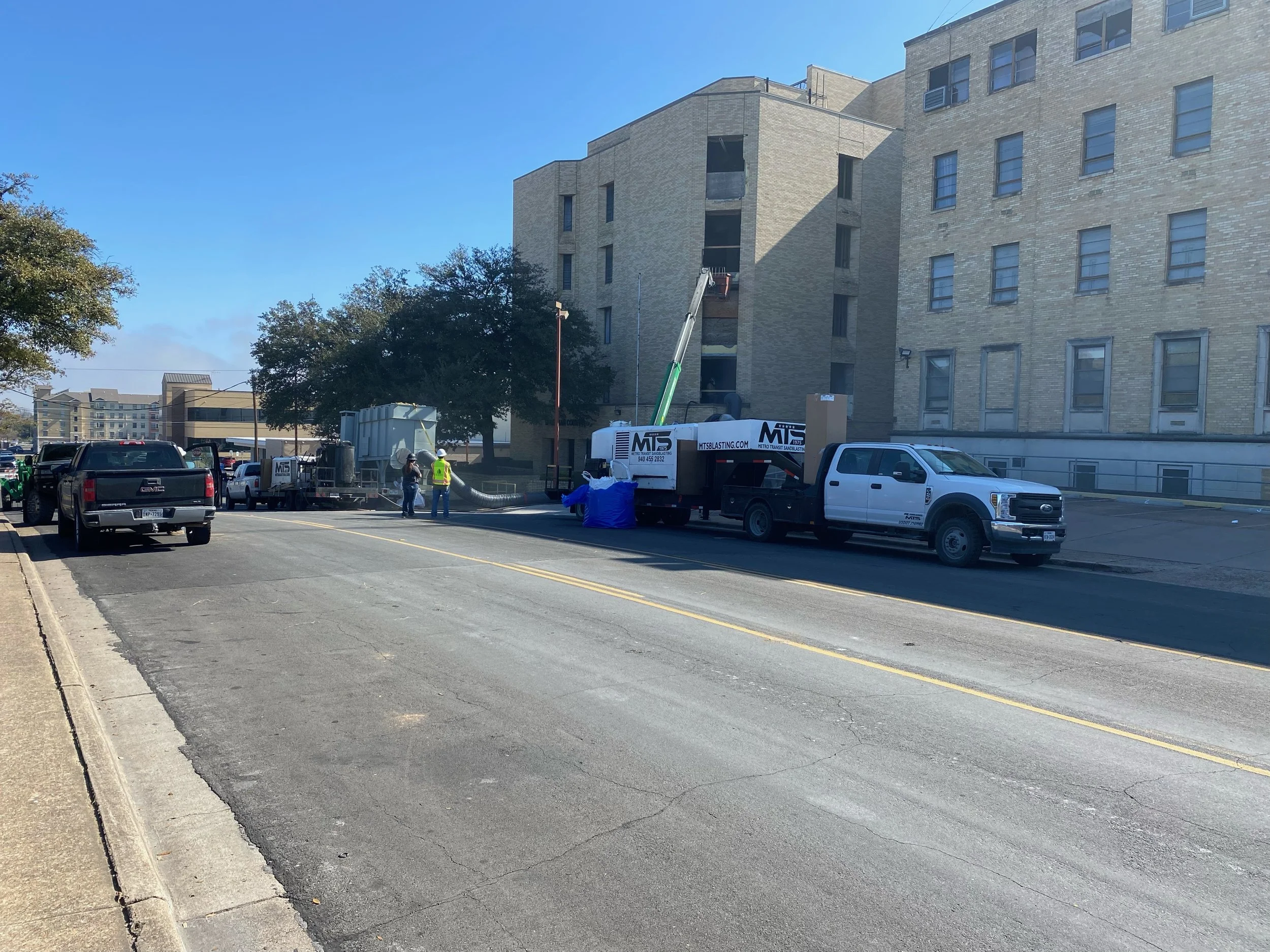 MTS sandblasted to remove failed paint on concrete tiltwall panels.
